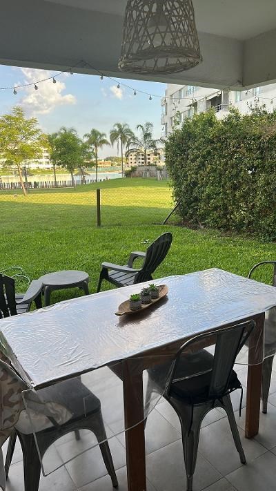 CUENTA CON AMPLIO LIVING CON COCINA INTEGRADA SUPER LUMINOSO CON SALIDA AL JARDIN Y VISTA A LA LAGUNA.
